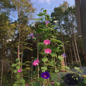 数年前から毎年こぼれ種で咲く西洋朝顔です。小輪ですがとても丈夫でかわいい花です♪他に、白で底がピンクのと、白に紫の絞りの花の、3種類が出ます。昔、カーニバルオブベネチアという、英国産のミックス種を播いたことがあり、その子孫かなと思ってます。