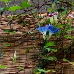 おはようございます 端のプランターから出ていた朝顔に初めてお花が咲きました 今頃になって? 蕾がまだあります これはこれで楽しみです😊💙🤍💙