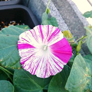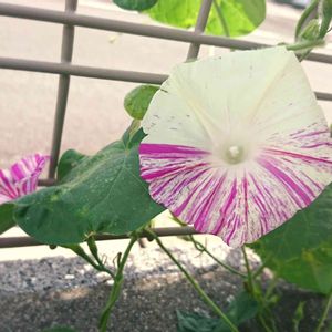 今日のお花 朝顔 3年連続で育てている 西洋朝顔 フライングソーサー 一輪一輪花の模様が違う楽しい朝顔。 日本の朝顔と違って葉っぱはハート型、ツルはめちゃくちゃ伸びやすく一株で大きくなります。 朝だけじゃなくて夕方近くまで咲いてくれるし、花の開花は遅めで秋に入った頃に1番たくさん咲いてくれる。 種は出来にくくて、自家製の種は発芽率も悪く、春に撒いて夏の終わりに発芽してびっくりすることもあるので苗や種を買うのがおすすめ🤭種は細長い感じです。 今年はまだ咲いてなくて、これは去年のお花達です。 ヘブンリーブルー(天上の青)とパーリーゲートの交配種だそうです。