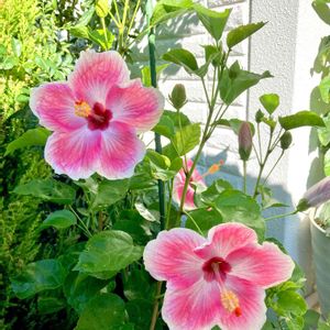 ハイビスカス🌺 ストロベリーアイス 咲きました🥰 なかなか目覚めずどうなることかと思いましたが、 頑張ってくれてます☺️ まだまだ蕾も上がってきてます。 生憎の台風で残念だけど、軒下でしのいでもらってます☺️