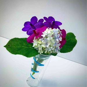 ミラーグラスと花の質感を合わせ左右比重のバランスを気を付けながら生けたミニ胡蝶蘭です。