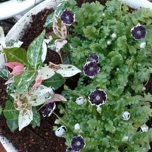 ネモフィラ ペニーブラックさん 近所の種苗店が夕方後片付けしているところを無理言って開けてもらい、見つけました。弱々しい苗でしたが復活してくれてます…もっともっと大きくなあれ🤗