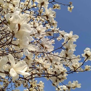 おはようございます👋😃 昨日、青空の下を孫(1歳3ヶ月)と散歩。見上げる民家のブロック塀から伸びた大木には、真っ白な花が咲き、見事でした~✌️ 白木蓮と思って見上げてたけど、近所で見かける白木蓮(チューリップ咲き)より花が開いてる。 花の下に葉っぱ🍃、拡大しても見えないと思うのだけど🤔 これは、白木蓮かコブシか⁉️一昨年、タムシバという名前も教えてもらったなぁ。 教えて下さい。どちらでしょうか⁉️Google先生に尋ねても、どちらの答えも出てきます😅 孫連れての散歩、この写真しかありません🙏💦💦 (2023/3/10撮影)