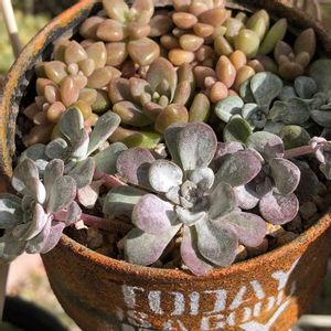 我が家の白雪ミセバヤ。 紅葉して? 紫になったの😍 後ろにあった斑入りベビーサンローズは 何ヶ月経っても不調なので、 カット苗を狩ったんだけど 入り切らなかった姫秀麗と入れ替えました。
