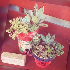 この間作ったリメ鉢と、作り置きのリメ缶に寄せ植え♡ リメ鉢の方のダシフィルムがポロポロ落ちて苦戦しました💦 赤は多肉が映えるなぁ✨