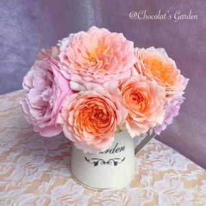 ロマンティックアンティークをメインに少し青みが入ったライラックピンクのバラシャンテロゼミサトとシャルムを入れてみました🥰