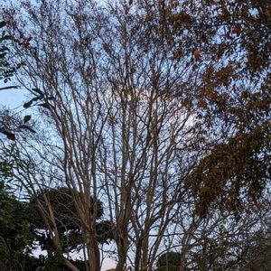 庭の百日紅… 高木の親木は赤っぽく 池の端の子株は未だ黄色っぽく 紅葉しています 🏷樹木見上げ隊