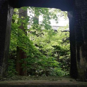 🏷️[額縁シリーズ] 昨日職場の友達と三人でドライブ🚗💨 立ち寄った記念館の入口に木の頑丈な格子戸の門があった。 格子戸の間から覗いて見たモミジ🍁