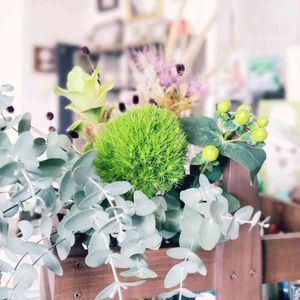 いつも見て下さる皆様 連続投稿ばかりで 失礼しています💧 たまには切り花も 良いものです😊 ユーカリと一緒に グリーンのお花や実を💚 後方の秋色のお花は フェイクです😆