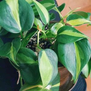 フィロデンドロン、オキシカルジウム(別名ヒメカズラ) サトイモ科 原産地 (メキシコ東部、西インド諸島) 強い日差しの当たらない明るい日陰で育てます。冬越しは最低温度は7~8°ぐらいです。😊 ハート形で艶やかな緑に黄色の斑入りがとっても綺麗です。💚💚💛 一見ポトスと似てますが、葉が肉厚で斑入り模様が違いますね。(*^-^*) つる性植物です。🍀☘️ 友人より挿し穂を頂き、挿木しました。 🌱🌱