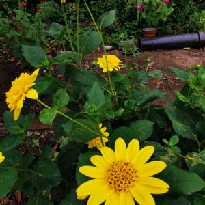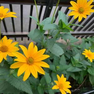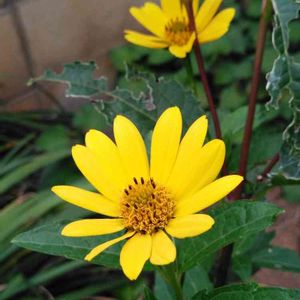 午後の庭から☕️ 🌻宿根ヒマワリさん🌻 夏の間に最盛期も無く秋になってしまいました😅 後ろのサルスベリさんの葉は紅葉が始まって来ましたが🍂ヒマワリさんは枯れる様子もなく地味に咲いています😊