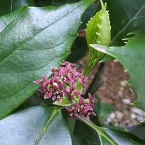 膝くらいの高さの植え込み、目を近づけると、小さな白い花が咲いていました❗️ ヒサカキですね💞 しゃがむことが出来ないのでこれ以上🆙に出来ませんでした😢