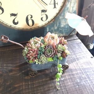 先日のフラワーandグリーンマルシェで購入した荷車に寄せ植え かわいい色になった姫秋麗がポイントです。
