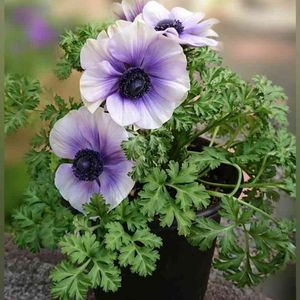 💜アネモネ💜 何回か登場しているアネモネさん💜 今、こんな状態です🌼 4つの花が一辺に咲き、花首も短く窮屈そう😰 待機している蕾も6個💦 1つずつ咲いていた時は花も大きく立派でしたが、今は一回り小さなお花になって皆で咲いています🌼🌼🌼🌼 このままでいいのかなぁ🤔 鉢ましした方がいいのかなぁ🤔