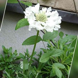 ☆スカビオサ ファーマホワイト☆ ここ何年かスカビオサの可愛いさにすっかりはまり、何種類か我が家にお迎えしています🤗🎶 このスカビオサも秋に苗をお迎えして、冬越ししての1番花です😆🎶 とても大輪で✴️美しい✴️です😍💗 他の種類もドンドン蕾が上がってきてワクワクしています😆💓 斜めに伸びている葉はクレマさんです💨