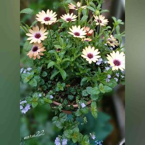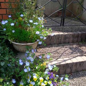 💛寄せ植え💜 オステオスペムマム💛の周りをベロニカ マダムマルシアが囲みます💜 マダムマルシアさんはオックスフォードさんの兄妹かなぁ💜💙 オックスフォードさんの後から咲きだし、葉🌱は光沢があり、花は薄いパープル💜 マダムマルシアさんもとても可愛いお気に入り🌟 この寄せ植えにはシレネ ガリカ❤️さんがこぼれ種で出ています⤴️ これが凶と出るか😨吉と出るか😁