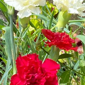 種からのカーネーションが咲いてます💁🏻♀️ 白系 赤紫 赤系です‼️ 数日前の雨で白にピンクのラインが入ってたお花はダメになりました💦 またこの秋に種を蒔いてみよ〜☺️❣️ おすすめです😁‼️