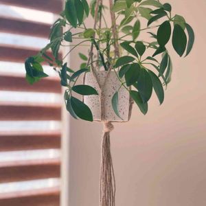 プラントハンガーは自分で編みました。 ブロック肉を縛る紐で編みました。 ウッドビーズを間に挟んで ちょっとアクセントをつけました。