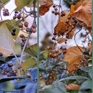 駐車場奥の南天に絡まったヘクソカズラ。10日余りで葉がすっかり茶色く、実の色も濃くなっているよう…。(左→右) 🏷ちっちゃいものクラブ …お願い致します。 🏷グリーンアクセサリー♪…も。リースの材料と云うことで…😅