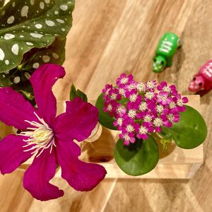 クレマチス、サビ病なっちやったから半分切り落とした😱 残りっカスをテーブルに笑