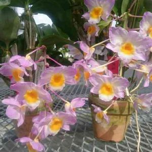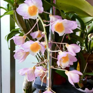 はじめて購入した蘭💚 デンドロビューム ファーメリー Den.farmerii (Pink) 購入から1年たって、無事開花しました❣️ やっぱりお花少ないですけど🤣 淡いピンクに鮮やかなオレンジ、可愛いです💕