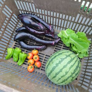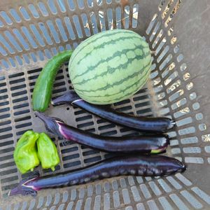 今朝の収穫です。小玉スイカ(ピノガール)は今期初収穫でした🍉今年は暑すぎが原因か、ナス、キュウリが不調です💦