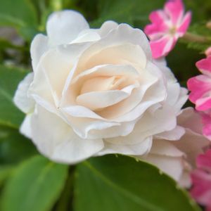 💐お花が寄りそって ささやいてるみたいです(*´∀`)♪ “インパチェンスさん、キレイキレイ💕 薔薇かと思っちゃった❗️” “バーベナさんもカワイイよ❣️ 今年はナメクジ大変だったね〜” .・。:**・ ╰(*´︶`*)╯