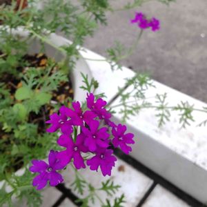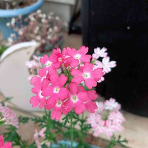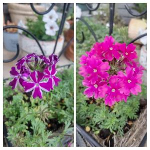 宿根バーべナ ・クマツヅラ科 ビオラも終わり、ベランダが 寂しくなったのでお迎えしました。 5色有ります😃 でも撮影した次の日 ナメクジに……😨 花は半分になっています💦