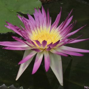 おはようございます♪ 雨☔が強く降ったり止んだり変化が激しいです 神代植物公園の熱帯睡蓮 7/13 💖ダーシー・プレスネルNo.62💖 今シーズン入った新品種です 花弁中央は黄色、元は白で花弁先に行くほどピンクが濃くなっていき、細長く大きく開きます 🍃葉は緑色で薄く茶色の丸い模様が入る、葉裏は薄い赤色。