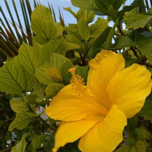 同じ散歩道の、こちらは正真正銘ハイビスカス。ハイビスカスは本当にたくさんの種類がありますね。何という種類かおわかりの方教えて下さい。 (夕方の光の中で。葉も花も色加工なしです。)