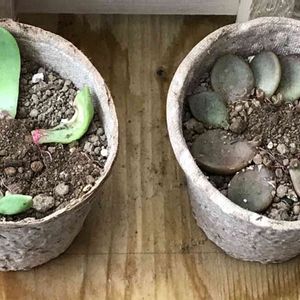 教えてください🙇♀️🙇♀️🙇♀️ このレディジアちゃん、親株の両脇にべびちゃん2つずつついており、上から見るとママは両手でほっぺたを押さえられているかのような砂時計⌛️みたいな形です。 それでもこのまま植え替えしてしまえば良いのでしょうか? 頭を✂️したピーチプリデちゃんのべびちゃんも大きいこは3センチくらいになってます❗️どのタイミングで✂️やら、子株の株分けをしたらよいのでしょうか❓このこはまだこのまんまでひとまず植え替え待機中です💁♀️