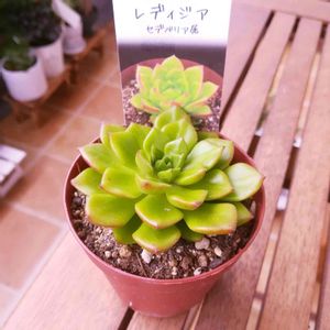 2020.10.10 土曜日に雨の中お迎えしたレディジアちゃん☆明るい葉色とうっすらと紅葉した縁が何とも可愛らしい多肉ちゃんです♪ 以前ナチュラルキッチンで買ったミニ多肉には「レティジア」と書いてあったので、音は濁ったり濁らなかったりするのでしょうか。エケベリア属だと思い込んでいたのですが、セデベリア属だと今さらながら気づきました(^_^;)