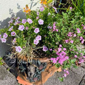 リスさん鉢のサポナリア オキモイデスがまたたくさん咲いていました♡ カリブラコア ウノダブル グレープフリルといい感じ♡