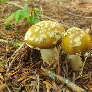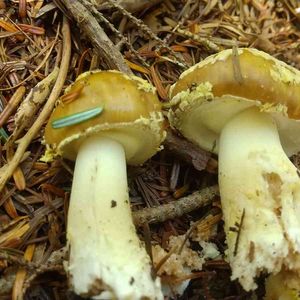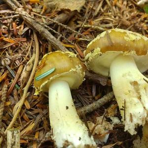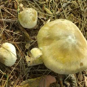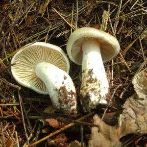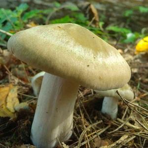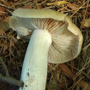 このキノコはなあに🍄 投稿の続きでご覧いただけるように、柄は根元に向かって太くなります。カサは真円ではなく、クレーター状の跡があります。傘のフチは内側に巻き込んでいます。柄を割いた写真もあります。中空ではありませんが、スキマがあり崩れやすい気もします。 松葉が林床にあります。 イッポンシメジ科にも思えますが、ウラベニホテイシメジでしょうか? 中央アルプス北部 標高1500m