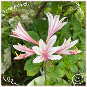 おはようございます😃 今日も皆さまにhappy〜💕 紅すじ夏水仙が咲きました♬ 鉢植えのまま〜3年目かなぁ〜急に茎がスルスル伸びてました♬無事咲いてうれちー😆💖