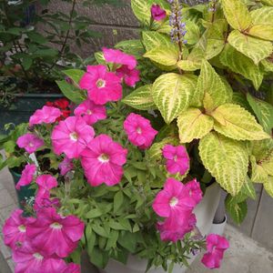 こんにちは〜。◕‿◕。 見切り品で購入したペチュニアと のびのびのコリウスをカットして 挿して寄植えにしました🍃💗💗🍃
