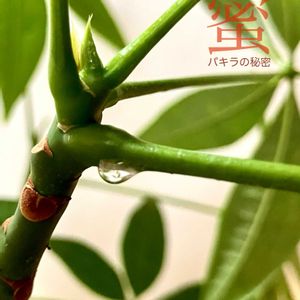 パキラは葉や茎にある 花外蜜線から分泌される 甘い樹液(蜜)を出しています この蜜は葉を食べる害虫を 駆除してくれるアリを誘引 するためのものです パキラは自己防衛のために甘い 樹液(蜜)を出しているのですね