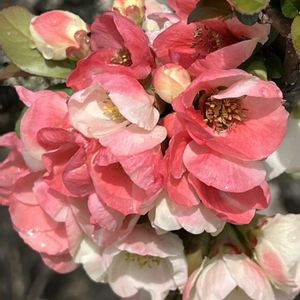 お隣の庭の、咲き分けする木瓜の花が素敵です 一株に赤、白、ピンク、オレンジの花びらです よく手入れされて、毎年楽しませてもらいます