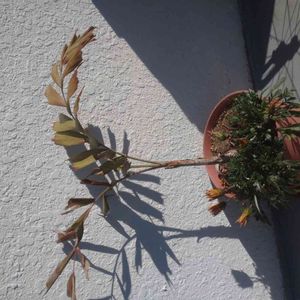 フォックステールパームです。 今年の冬は目立って暖かい日がなく、コンスタントに寒い日が続いた印象でした。 ベランダのシェードの中で冬越ししましたが、シェード内でも最低気温が氷点下になる日が4日ほどありました。ただ、-1℃を下回る日はありませんでした。 冬越しダメージとしては中くらいでしょうか。写真ではガザニアの濃い緑と対比されてしまいますが、写真よりもダメージは少ない印象です。