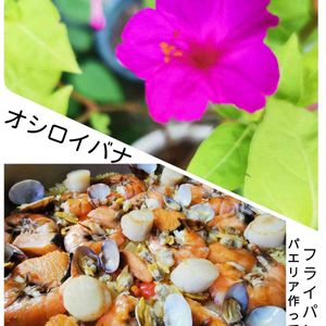 こんばんわପ(⑅ˊᵕˋ⑅)ଓ オシロイバナ& フライパンでパエリア作ってみましたあ〜〜。 どうかしら……🤭