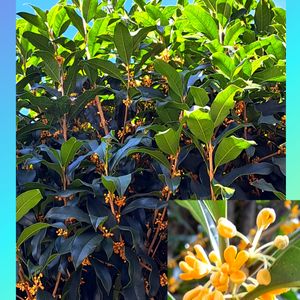 表の庭の「キンモクセイ」が、咲き始めてます💕 玄関を開けると、甘~い香りに包まれて、庭仕事中も癒されます(*´∀`)♪💓 青空に映えて、気持ち良さそう💝
