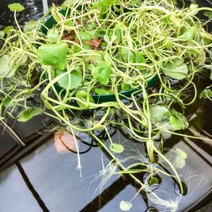 小川ブラックの鉢 ウォーターマッシュルーム 枯れた葉摘みして 赤玉土を足して 鉢を一回り大きくしました