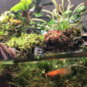 Drosera aderae です。 普及している種ですが、独特の葉の形と丈夫さに惹かれて、売られているとつい買ってしまいます。 タッパーで栽培していますが、よく増えてくれています。