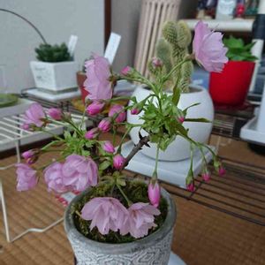 おはようございます☀ 我が家のサクラ‘アサヒヤマ’の苔玉。 ダイニングテーブルの上で見事に満開になりました〜🌸🌸🌸🌸🌸 本当の桜前線より1週間ほど早めかな♪ 何より部屋の中は雨も降らないので桜も散らずにずっと楽しめるのがいいトコロ😌 季節をお家の中に取り込むと部屋が明るい雰囲気になってイイですね🌸💡
