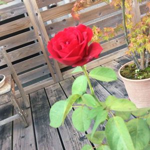 昨年秋に神代植物公園で買ったサムライの苗から真っ赤なバラが咲きました🙌😆 切り花でよく買っていたサムライ🌹が家のベランダで咲いてくれて嬉しい~😘🌹✨