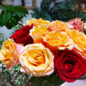 ベランダに咲いていたバラ🌹を切って、玄関に飾りました。 PWさんのユーフォルビアダイアモンドフロストを合間に入れてます。