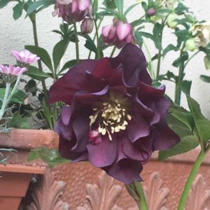 ダーク🍷なダブル クリロさんの開花苗をお迎えしました〜ヽ(´▽`)/ 昨日 クリロさんのナーサリーに花友さんの🚗で🌬お邪魔しましたが、開花が遅れているため、見学も購入もまだ始められないと言われてしまい残念ですが日を改めることに〜😢 が、しかし、それでは花不足?のまま〜💦 空振りでは気の毒だからと、秘密の花屋さんへ連れて行ってもらいました〜🚗🌬 そちらで、出会えたのが、このクリロさんでした😊