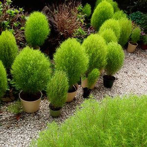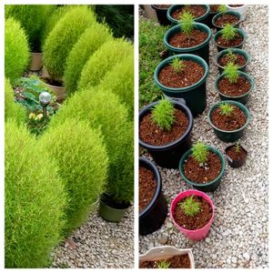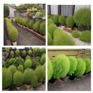 コキアたち 大きさもまちまち 鉢の大きさによる 花も咲きだし 色も少しずつ変化 コキアの間隔も拡げました フェンスの修理も終わりコキアたちも 平穏と安心との声が聞こえてきました🌱🤗