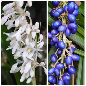 遊歩道の花 ジャノヒゲ ヒジカクシ科 ジャノヒゲ属 白い花びらが 輝くブルーの 実に変化😲 魅惑的です🤗 (右のpicは昨年)