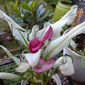 カラー フローズンクイーン 濃い色の花は枯れて、薄い色が咲いています。斑入りの葉がうつくしいです。